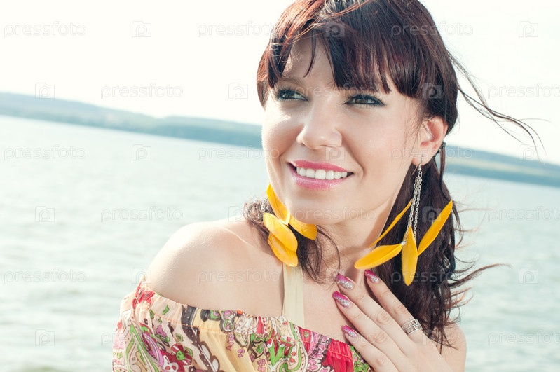Портрет улыбающейся молодой женщины на морском берегу, крупный план
