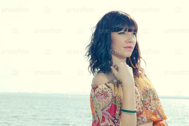 Задумчивая молодая женщина на морском побережье