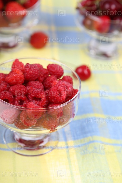 Малина, вишня и клубника в стеклянной чаше на льняной скатерти