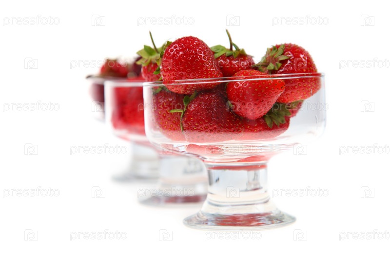 Малина, вишня и клубника в стеклянной чаше на белом фоне