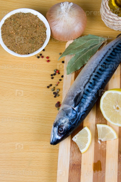 Сырая скумбрия с лимоном, специями и овощами на деревянном столе