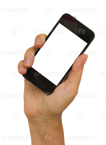 Рука держит и указывает на современный смартфон, изолированный на белом фоне с пространством для текста