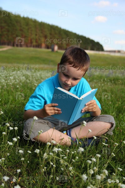 Мальчик читает книгу на зеленом лугу