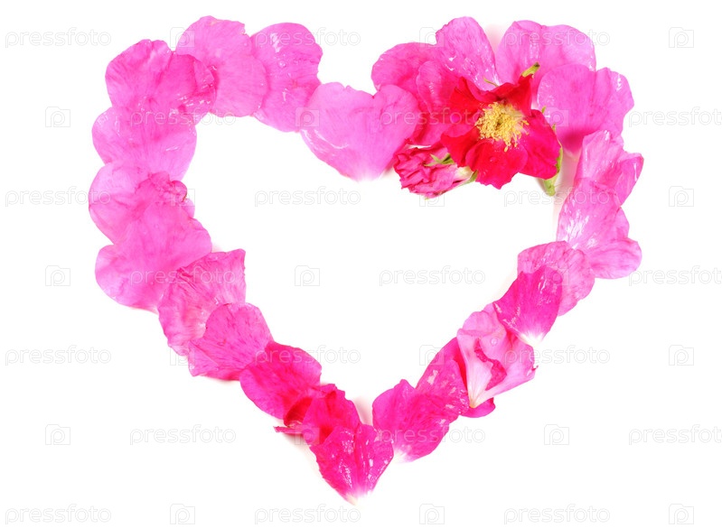 Сердце из лепестков роз на белом фоне