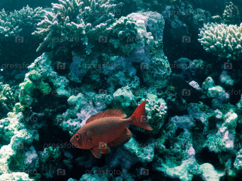 Красной рыба с яркими глазами на фоне кораллового рифа