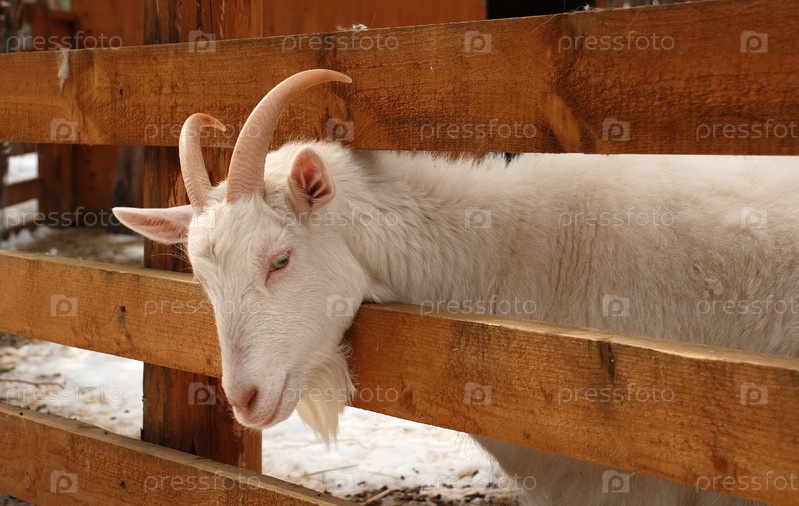 Козел просунул голову через жерди забора
