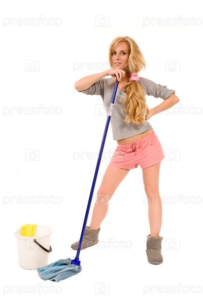 Молодая женщина со шваброй, работа по дому