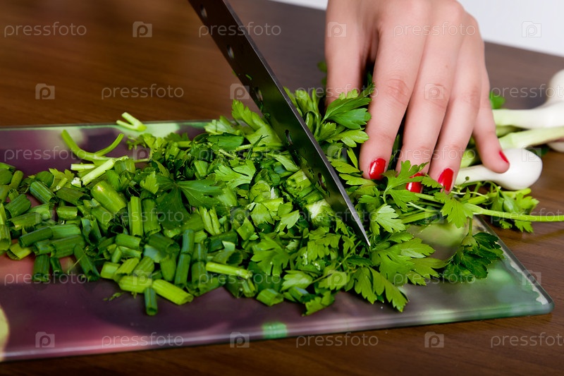 Женщина режет свежую зелень