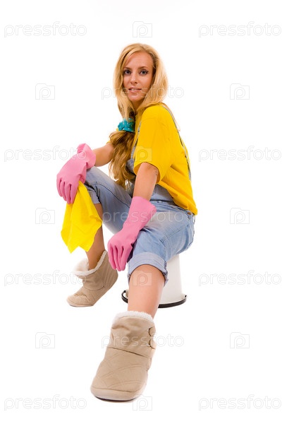 Молодая женщина занимается домашими делами, изолированная на белом фоне