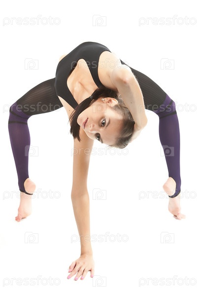Молодая красивая гимнастка тренируется на белом фоне