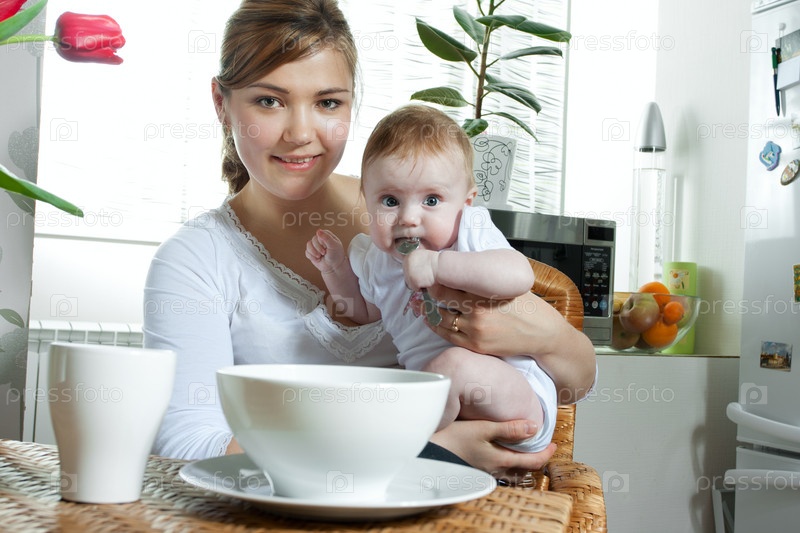 Молодая мама с малышом на кухне