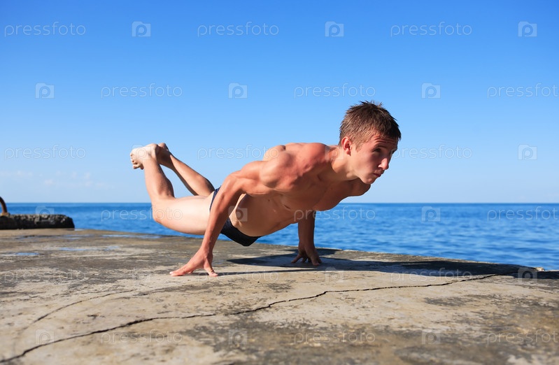 Молодой ильных подросток делает упражнения на пирсе у моря