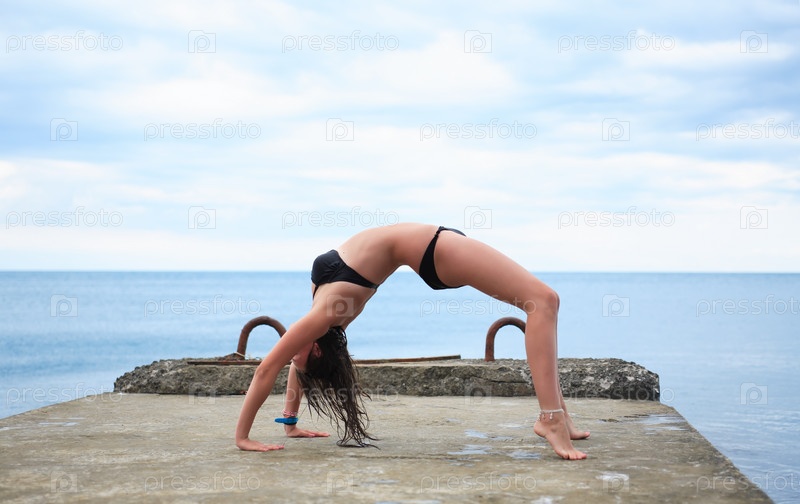 Девушка делает упражнения на причале возле моря