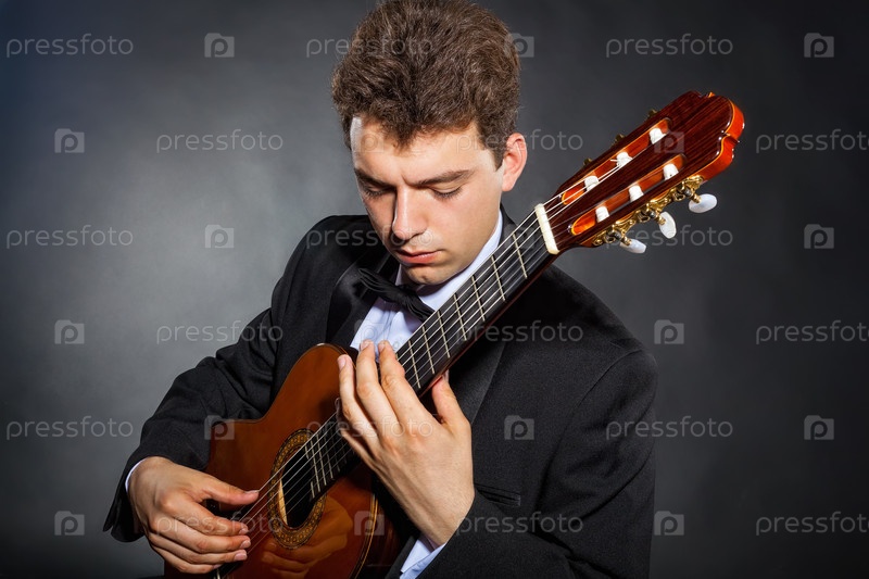 Гитарист. Мужчина играет на гитаре на черном фоне