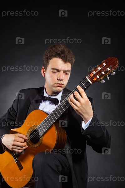 Гитарист. Мужчина играет на гитаре на черном фоне