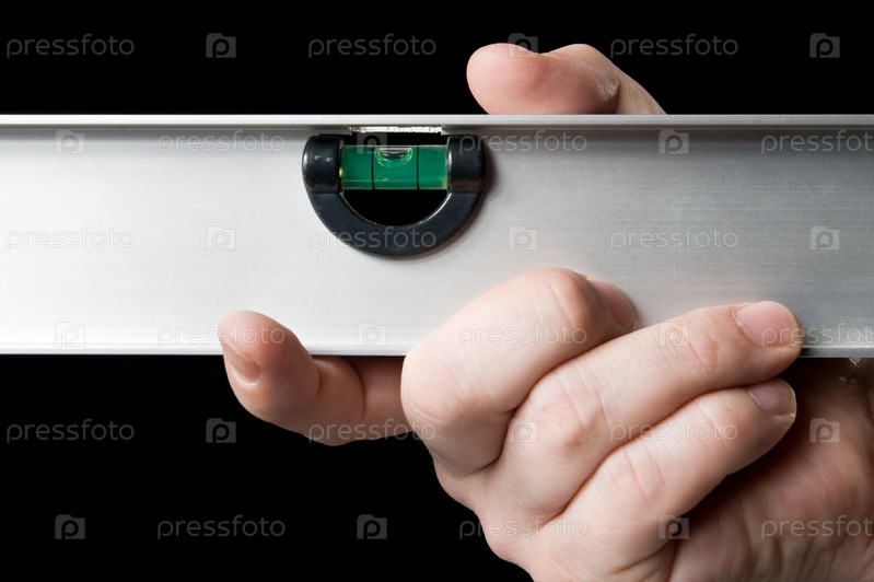 Строительный уровень в руке на черном фоне