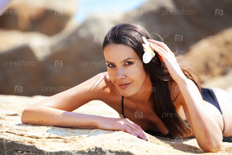 Портрет красивой молодой женщины с золотым загаром, отдыхающей на пляже летом