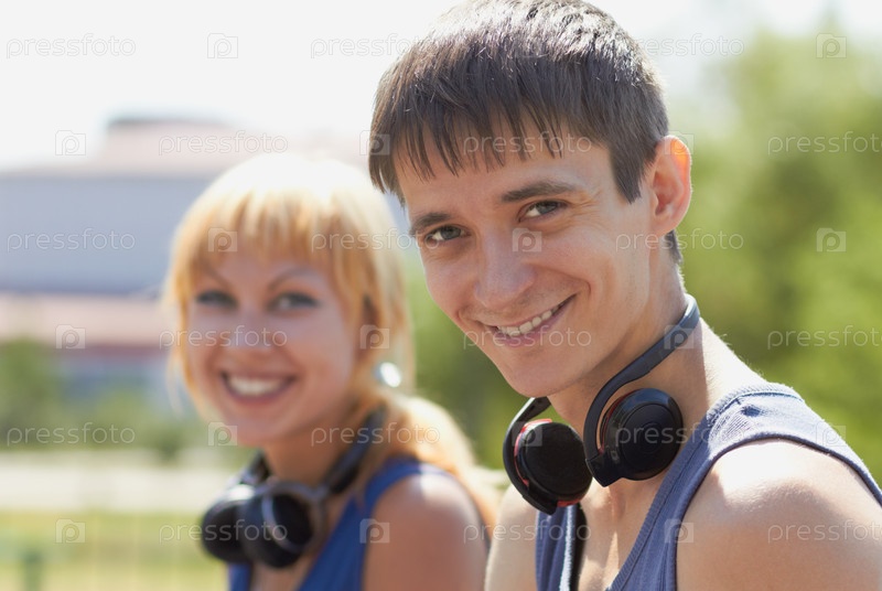 Пара улыбающихся подростков с наушниками сидит на свежем воздухе в яркий солнечный день