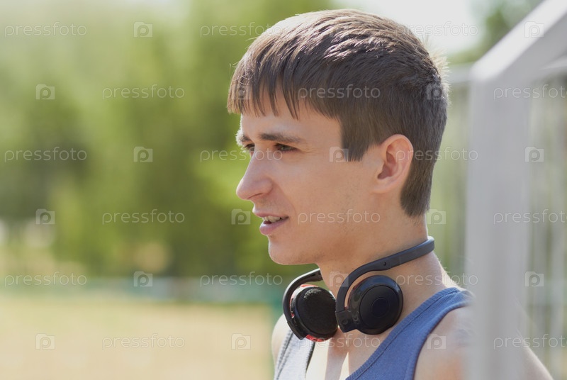 Парень с беспроводными модными наушниками на свежем воздухе в яркий солнечный день