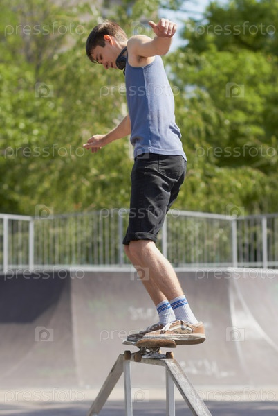 Экстремальный спортсмен делает классический 50-50 grind на квадратных железных перилах на вершине фанбокса в скейтпарке