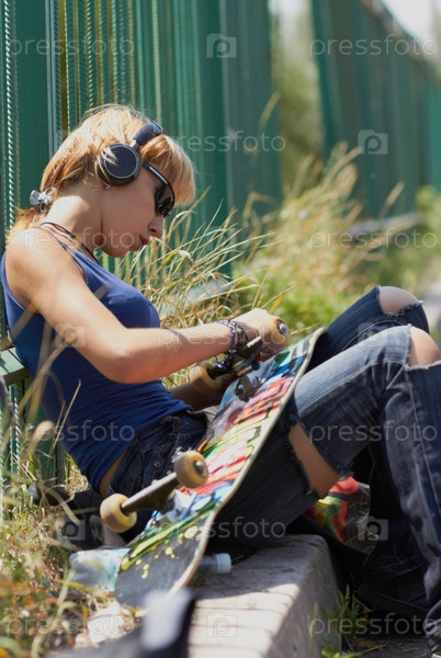 Девушка-скейтбордист в рваных джинсах ремонтирует скейтборд, сидя в модных беспроводных наушниках на улице