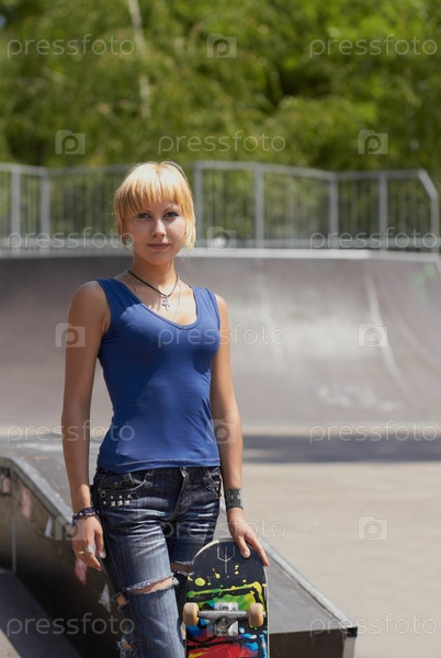 Девушка-скейтбордист в рваных джинсах готова кататься на своем скейтборде в скейтпарке под открытым небом
