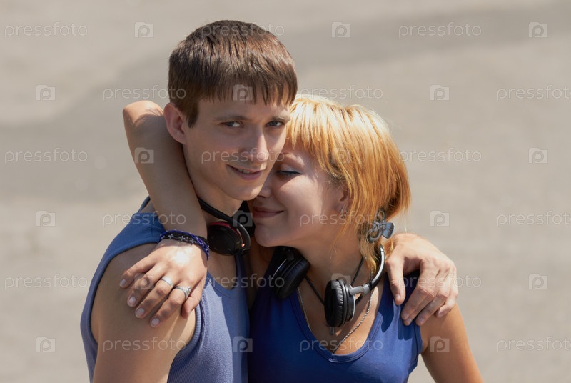 Пара улыбающихся подростков с наушниками на свежем воздухе в яркий солнечный день