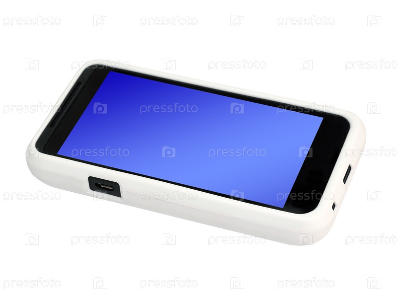 Мобильный телефон в белом корпусе с пустым экраном изолирован на белом фоне