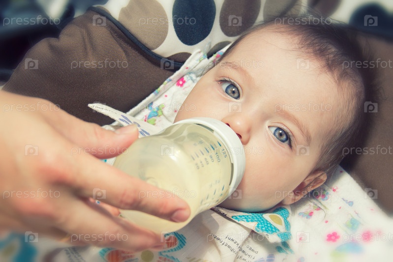 Ребенок в коляске ест из бутылочки