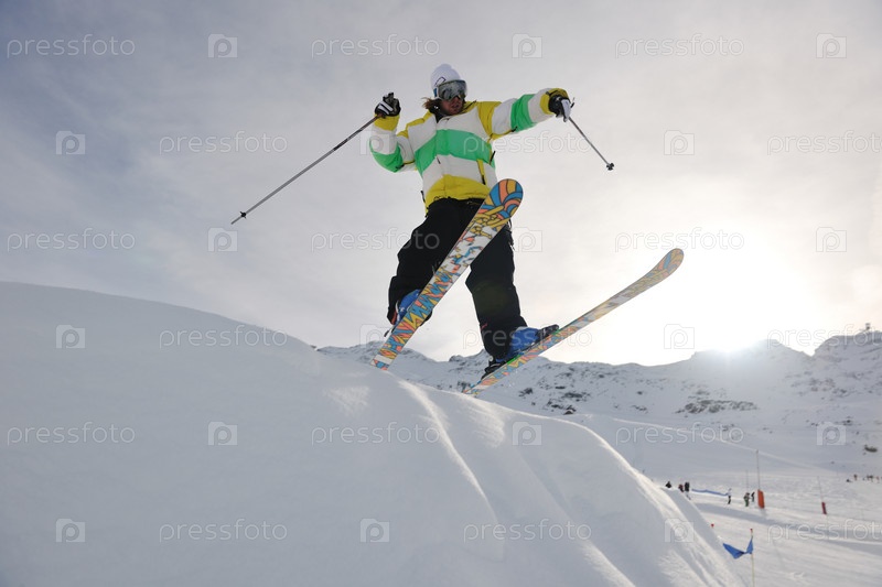 Экстремальный фристайл на трамплине. Молодой человек на горе в зимнем снежном парке