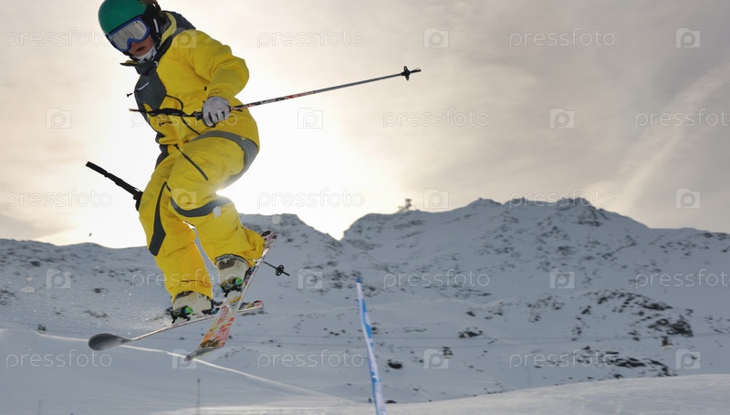 Экстремальный фристайл на трамплине. Молодой человек на горе в зимнем снежном парке