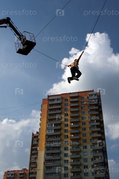 Парень, выполняющий трюк на высоте на фоне многоэтажного дома