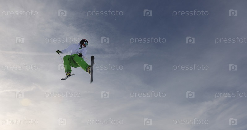 Экстремальный фристайл на трамплине. Молодой человек на горе в зимнем снежном парке