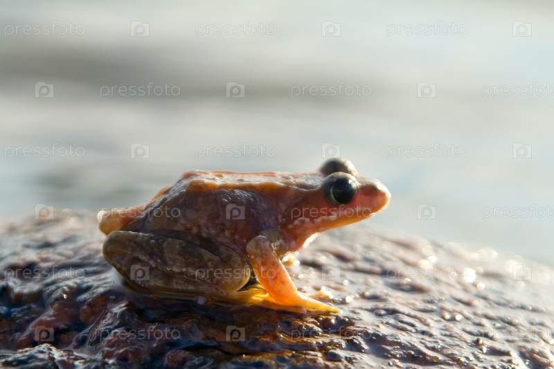 Коричневая лягушка, rana temporaria, на камне в воде