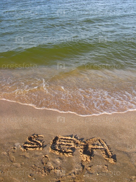 Панорама морских волн и надпись МОРЕ на песке