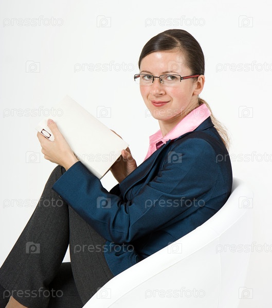 Девушка в очках с книгой сидит в кресле