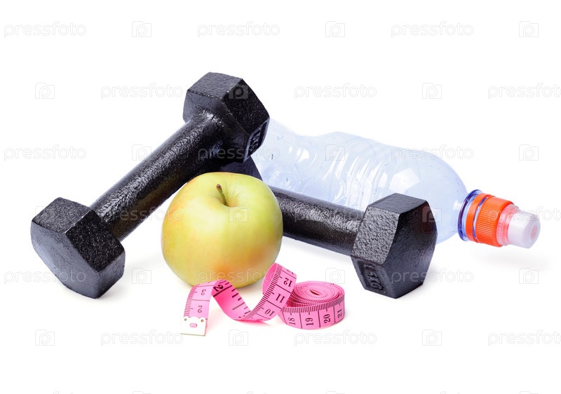 Гантели, яблоки, сантиметр и бутылка, изолированные на белом фоне