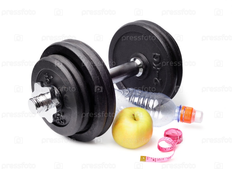 Гантели, яблоки, бутылка и сантиметр, изолированные на белом фоне