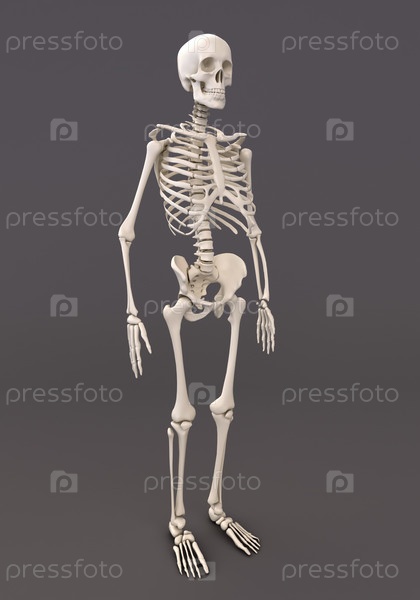 Скелет взрослого человека на сером фоне, 3d визуализация