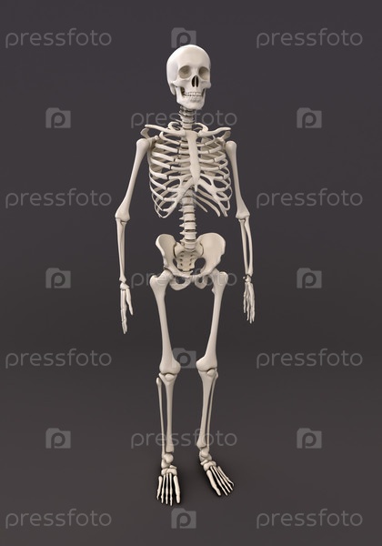 Скелет взрослого человека на сером фоне, 3d визуализация
