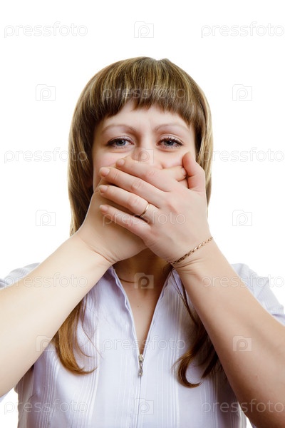 Молодая девушка закрывает рот руками на белом фоне