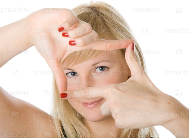 Молодая блондинка смотрит через раму, сделанную ее пальцами