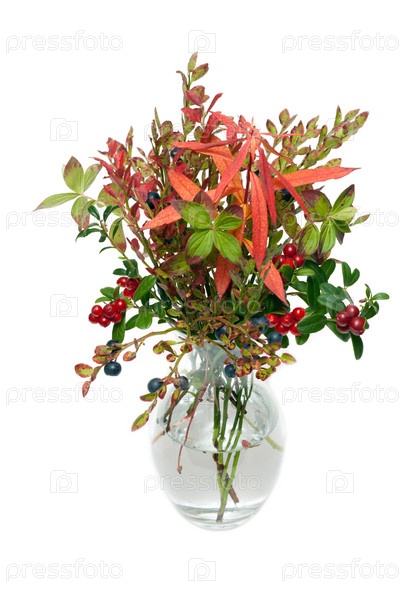 Веточки черники и брусники в прозрачной вазе