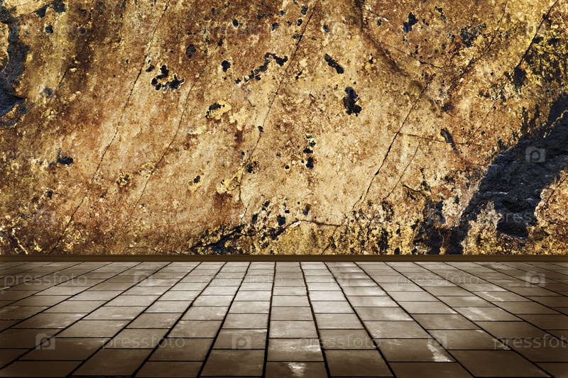 Иллюстрация. Интерьер комнаты с каменной плиткой и каменной обшарпанной стеной