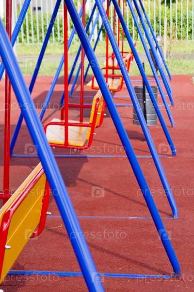 Цветные металлические качели с безопасным резиновым покрытием на площадке