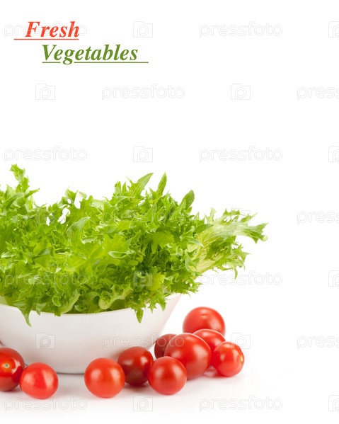 Листовой салат с помидорами, изолированные на белом фоне