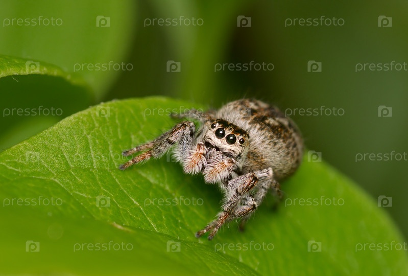 Лохматый паук сидит на зеленом листе