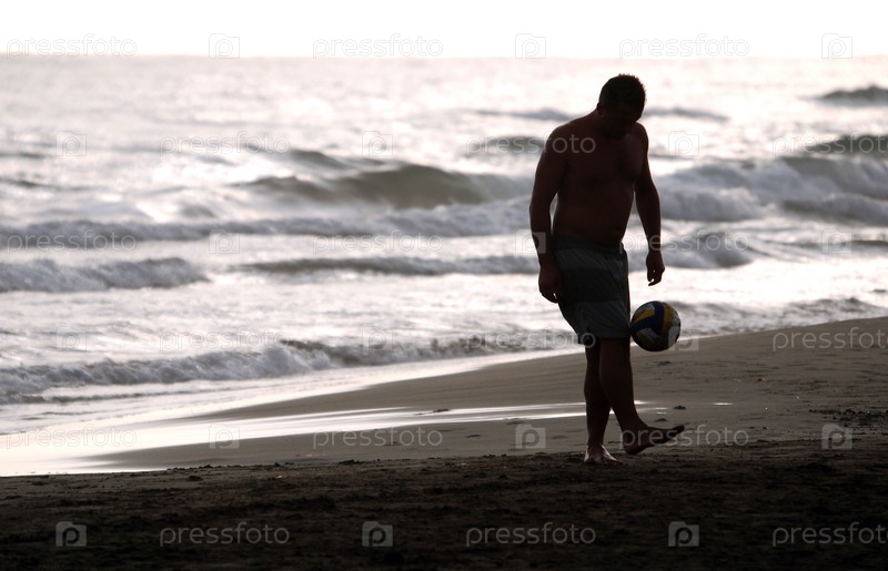 Мужчина играет в мяч на пляже