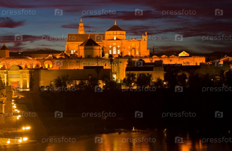 Старый кафедральный собор Мескита в ночной Кордове, Андалусия, Испания