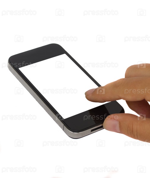 Палец указывает на современный смартфон, изолированный на белом фоне с пространством для текста